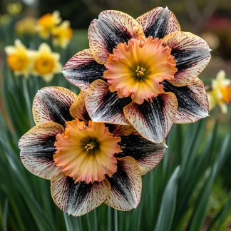 - Уникальная окраска: Главная особенность этого сорта – его неповторимая и экзотическая окраска. Лепестки нарцисса Кримен имеют нежный персиковый оттенок, который словно расписан тонкими черными прожилками, создавая эффект “мраморности”. Такая комбинация цветов делает каждый цветок уникальным и привлекательным.